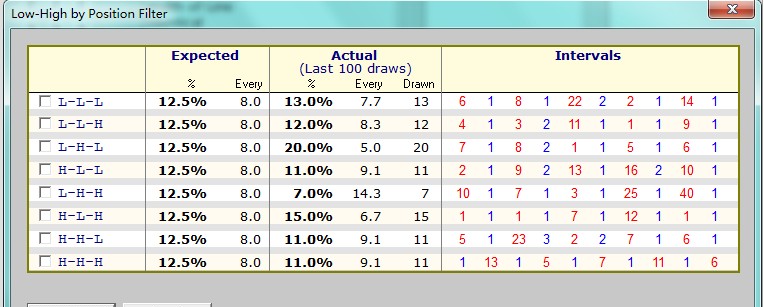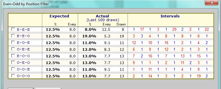 :1机1球 最近100期“线数的宽度过滤":1机1球 最近100期组选6/3排列参考图表:3个号码的排列方式:1机1球 最近100期“偶数与奇数位置" EO-pos: 偶数位置[2.4.6.8.0.]-与奇数位置[1.3.5.7.9.]:1机1球 ![]() 最近100期“小数与大数位置" LH-pos: 小数位置[0.1.2.3.4.]-与大数位置[5.6.7.8.9.]:1机1球